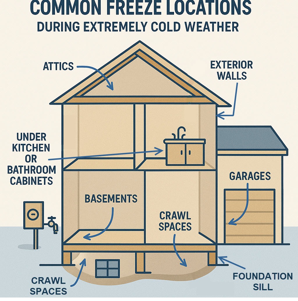 - Pipes installed in crawl spaces under a house or adjacent to the basement